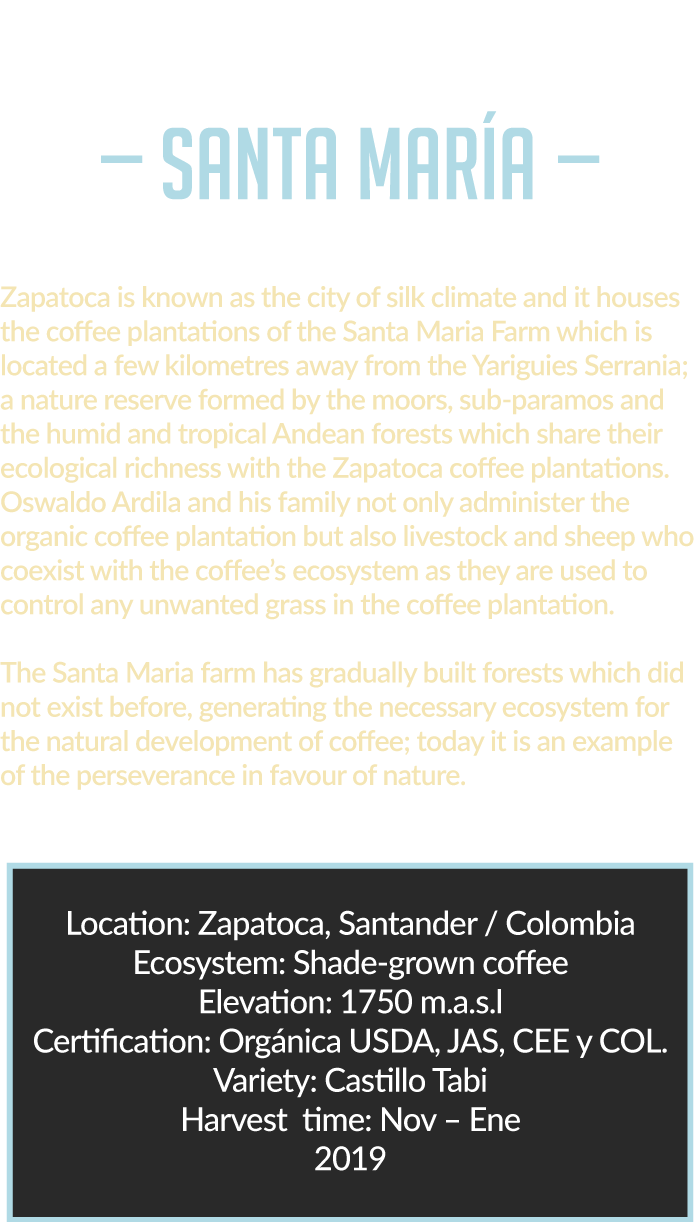 Variety: Colombia amarillo, Castillo, Tabi, Geisha, Bourbon rosado