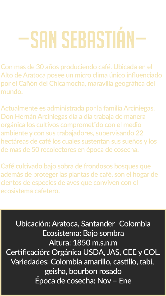 Ubicación: Aratoca, Santander -Colombia​ Ecosistema: Bajosombra​ Altura: 1900 msnm​ Certificaciones: Orgánica USD, JAS, CEE y COL Variedades: Castillo, Tabi, Laurina ​ Época de cosecha: Nov - Ene​